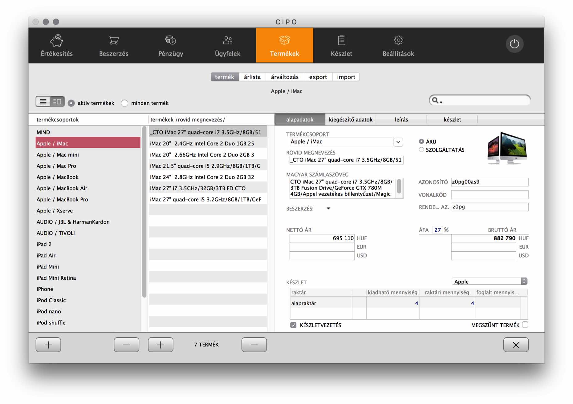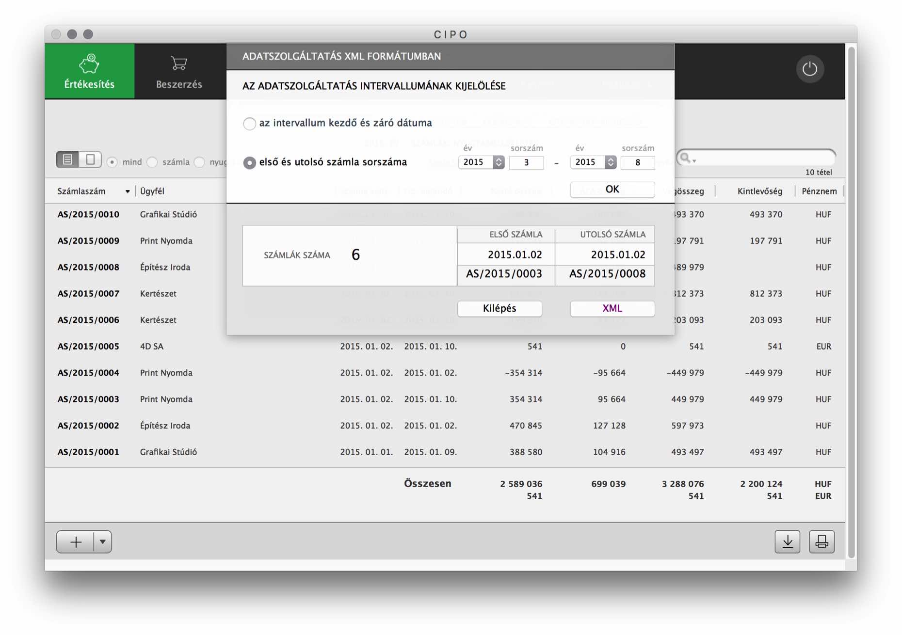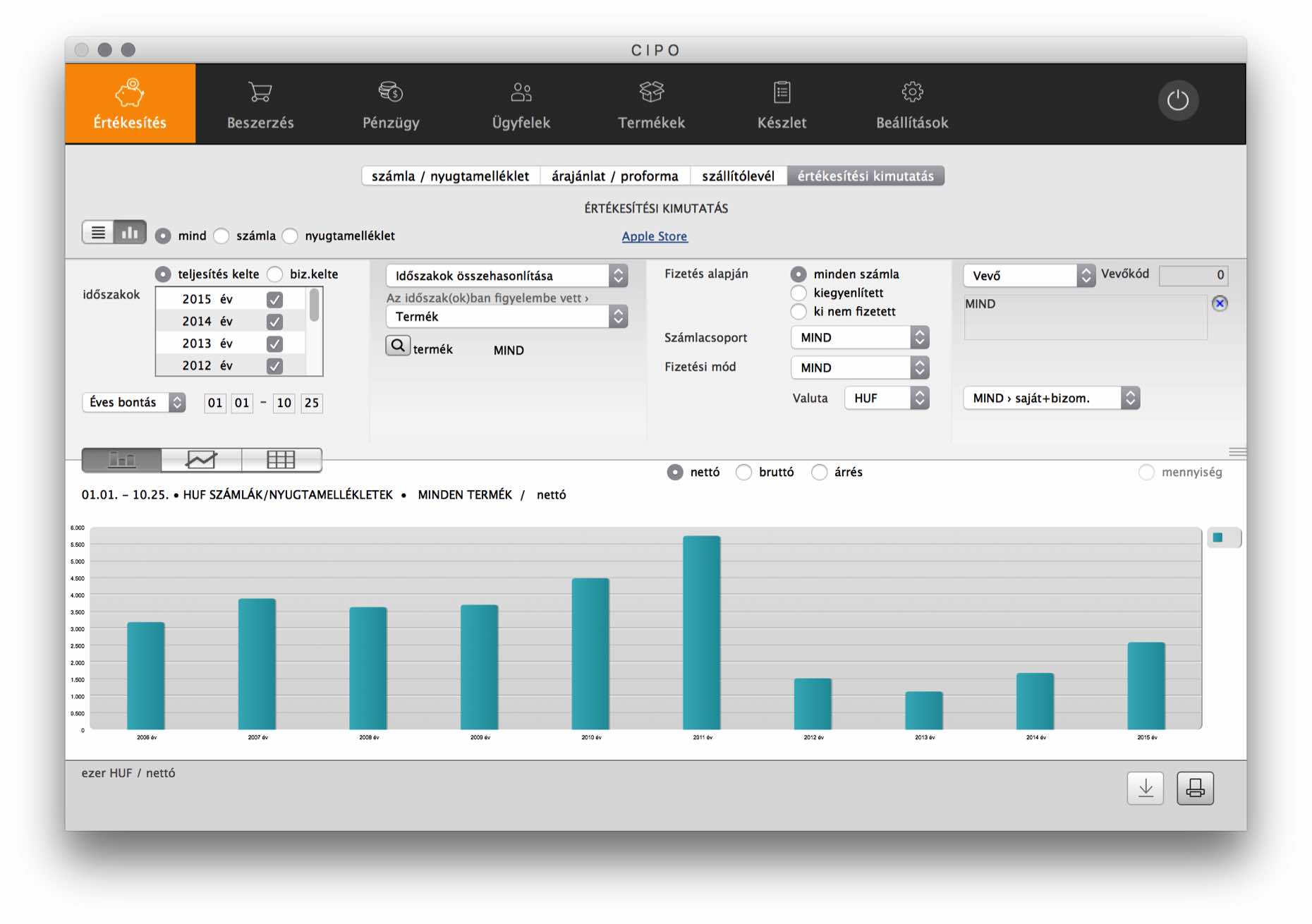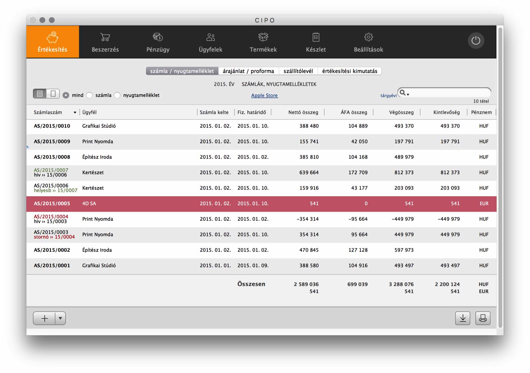A CiPÓ könnyen átlátható, egyszerűen kezelhető, modulos felépítésének köszönhetően igény szerint bővíthető ügyviteli program Mac OS X-re. Bővítő modul nélkül, az alapprogrammal is számlázhat, forintban, nyugtamellékletet készíthet, a számlákat elküldheti pdf formátumban e-mailben. Egy tucat számlaminta közül választhat, amelyekre egy kattintással ráteheti cége logóját. A számlarögzítés a valósághoz közelítő felületen történik. Több soros tételszövegeket rögzíthet, amit gyakori szövegek felvételével és beszúrásával gyorsíthat. A tételekhez százalékos vagy összegszerű engedményt adhat. Kezelheti kinnlevőségeit,. A számlákat tartalom alapján vagy összetett szempontok szerint keresheti, szűrheti, amiről aztán különféle tételes listát, összesítéseket, egyenlegközlőt nyomtathat illeve exportálhat .xlsx formátumú excel fájlba. Hat különféle színbeállítás közül választhat, tetszése szerint.